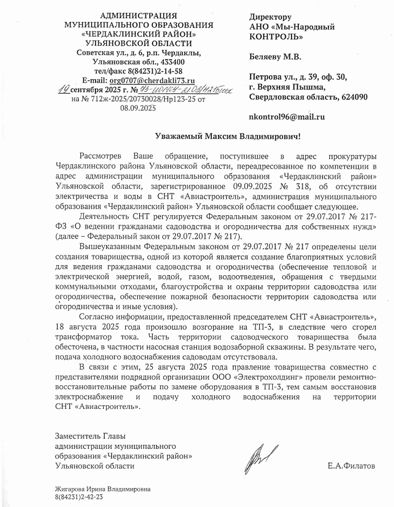 В ответе администрации Чердаклинского района, направленном после проверки, сообщается, что причиной аварии стало возгорание на трансформаторной подстанции (ТП-3), которое обесточило насосную станцию. Власти ссылаются на Федеральный закон № 217-ФЗ, возлагающий ответственность за инфраструктуру на СНТ, и уведомляют, что правление товарищества совместно с подрядчиком уже провело ремонтные работы 25 августа, восстановив подачу электроэнергии и воды.