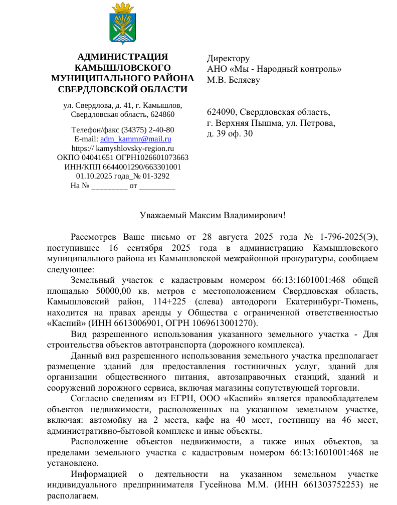 Администрация подтвердила, что земельный участок площадью 5 га арендует ООО «Каспий», а вид разрешенного использования позволяет размещение автозаправочной станции, гостиницы, кафе и других объектов дорожного сервиса. В ответе указано, что все объекты недвижимости расположены в границах участка и зарегистрированы в ЕГРН. При этом местные власти заявили, что проверка деятельности этих объектов не входит в их полномочия, фактически отказавшись от каких-либо действий по выявленным нарушениям.
