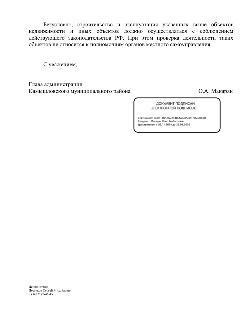 Администрация Камышловского муниципального района признала законность размещения объектов, но отказалась от проверок.