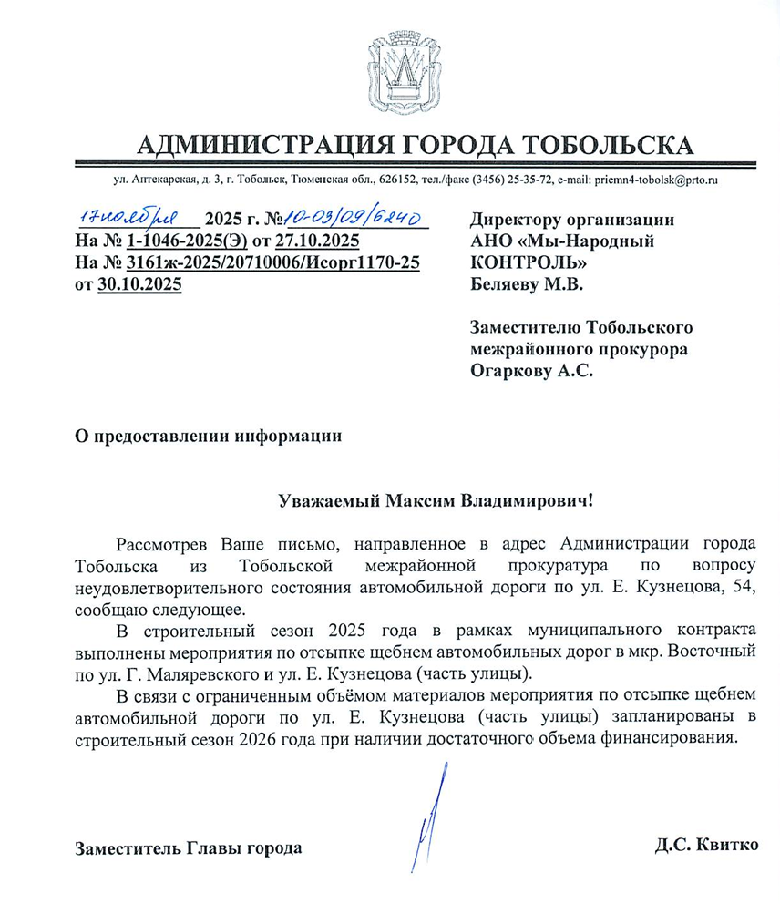 В конце октября из Тобольска было получено обращение о неудовлетворительном состоянии дороги в микрорайоне Восточный, напротив дома 54 по улице Евгения Кузнецова. Жители отмечают, что на этом участке образовалась глубокая яма с постоянной лужей, из-за чего невозможно ни проехать, ни пройти. Сообщалось, что представители администрации приезжали на место, зафиксировали проблему фотографиями, однако никаких действий по её устранению не предприняли.
