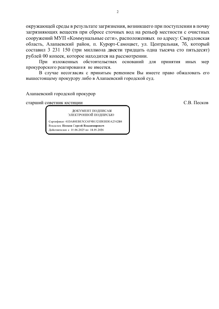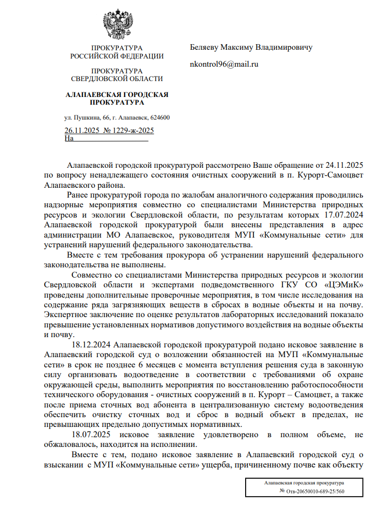 По результатам проверок установлено, что требования о восстановлении работы очистных сооружений, ранее внесённые прокуратурой, не выполнены. Экспертные исследования показали превышение допустимых норм загрязняющих веществ в воде и почве. В июле 2025 года суд обязал МУП «Коммунальные сети» восстановить работу оборудования и обеспечить очистку сточных вод в рамках нормативов, а также находится на рассмотрении иск о взыскании ущерба в размере 3 231 150 рублей, причиненного почве.