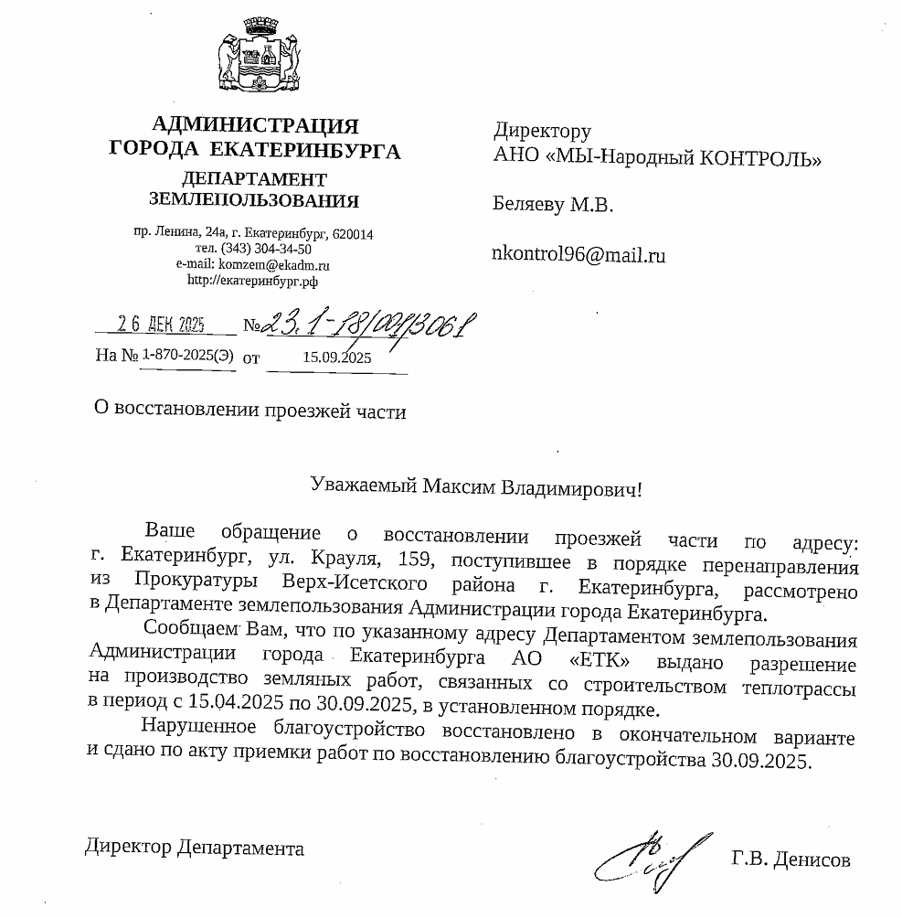 В ответе уточняется, что АО «ЕТК» имело разрешение на проведение земляных работ по строительству теплотрассы с 15 апреля по 30 сентября 2025 года. Нарушенное благоустройство участка дороги было восстановлено и сдано по акту приемки работ 30 сентября.