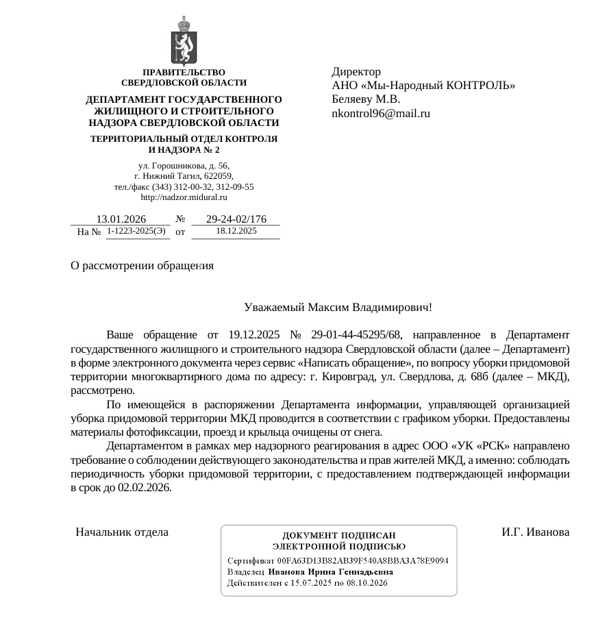 В декабре 2025 года из Свердловской области поступило обращение по вопросу уборки придомовой территории многоквартирного дома по адресу: г. Кировград, ул. Свердлова, д. 68б. Жители отмечали, что двор и подъездные пути убираются нерегулярно: снег своевременно не очищается ни на крыльцах, ни на проездах, из-за чего затруднён доступ спецтехники, включая автомобили скорой помощи.