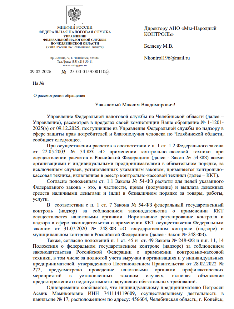 Однако проверки на этом не закончились. Недавно пришёл ответ от Управления ФНС по Челябинской области.