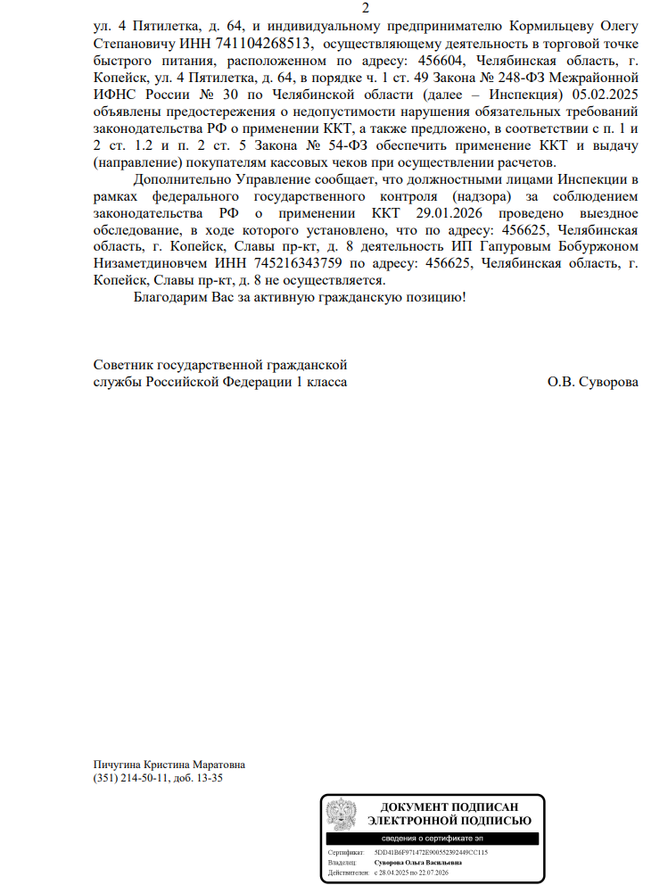 ФНС отреагировала на рейды в Копейске: двум предпринимателям вынесены предостережения