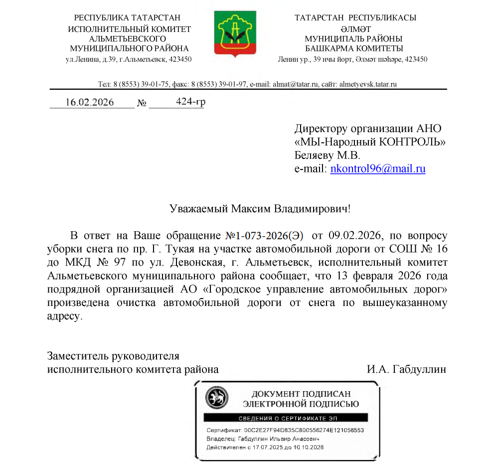 В ответе сообщается, что 13 февраля 2026 года подрядная организация АО «Городское управление автомобильных дорог» провела очистку автомобильной дороги от снега по вышеуказанному адресу.