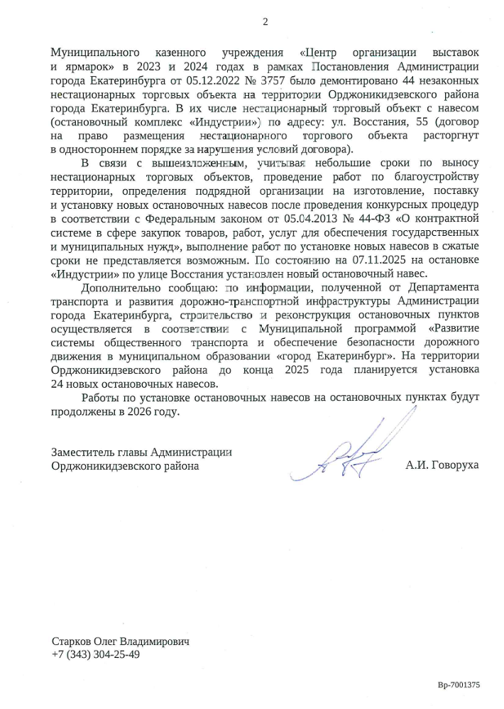 Всего в 2023-2024 годах на территории района было демонтировано 44 таких объекта, включая торговый павильон на остановке «Индустрии» по ул. Восстания, 55. В администрации отметили, что установка новых остановочных навесов осуществляется в соответствии с муниципальной программой. По состоянию на 7 ноября 2025 года на остановке «Индустрии» уже установлен новый павильон. До конца 2025 года в районе планируется монтаж 24 новых остановочных навесов, а работы в этом направлении будут продолжены в 2026 году.