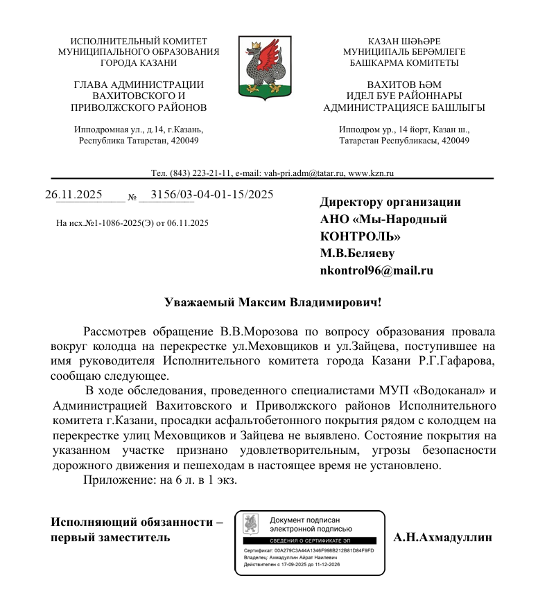 На обращение был получен ответ от Исполнительного комитета города Казани.