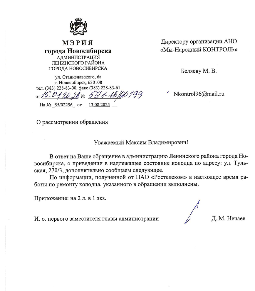 В ответ администрация Ленинского района Новосибирска сообщила, что обращение рассмотрено. По информации, предоставленной ПАО «Ростелеком», ремонт колодца по указанному адресу был выполнен, а объект приведён в надлежащее состояние, что подтверждается приложенными фотоматериалами.