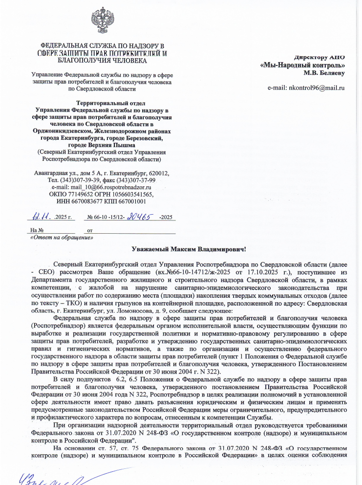 Ранее, департамент государственного жилищного и строительного надзора Свердловской области провёл проверку и установил, что уборка контейнерной площадки осуществляется: один раз в день, а обработка от грызунов проводилась трижды за летние месяцы. По итогам рассмотрения обращения компании АО «Орджоникидзевская УЖК» и АО «Спецавтобаза» получили официальные требования с контролем выполнения до конца ноября.