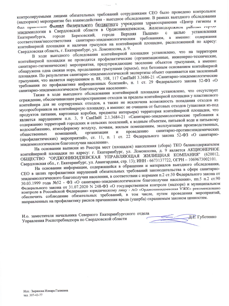 В сентябре из Екатеринбурга было получено обращение от жителей дома на улице Ломоносова, 9 с жалобой на бездействие управляющей компании АО «Орджоникидзевская УЖК». Жильцы сообщили, что на контейнерной площадке накопился мусор, расплодились крысы, а отходы разлетаются по дворовой территории.