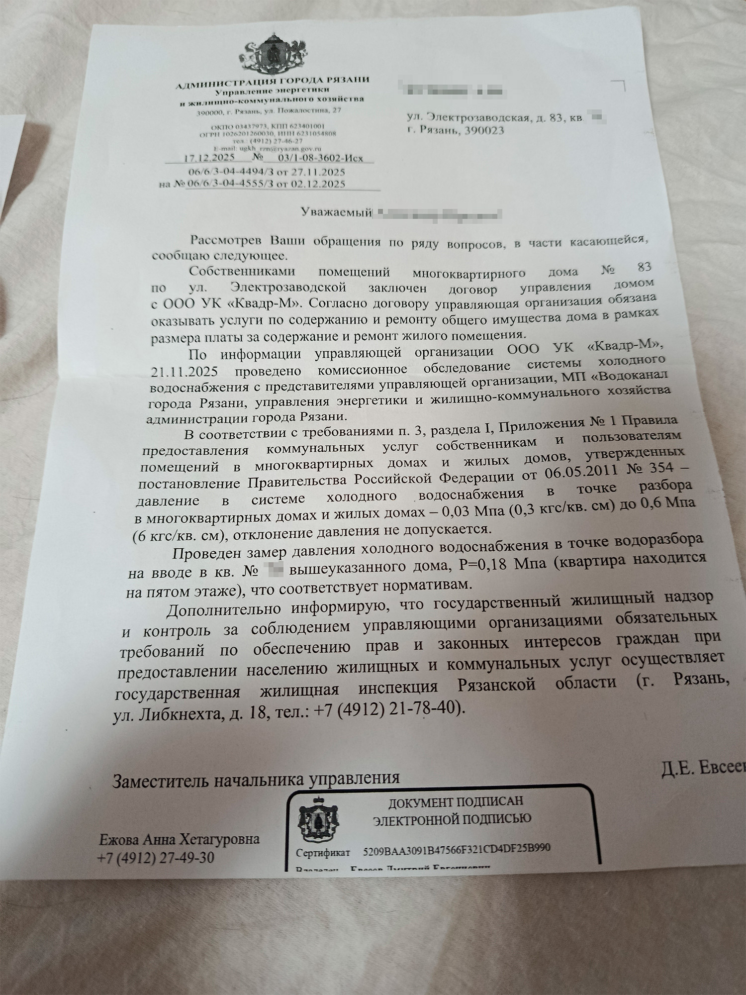 К обращению заявитель приложил ответы из инстанций. В них сказано, что УК по его заявке заменила участок трубы в квартире, а замеры показали давление в пределах нормы. В ГЖИ и администрации нарушений не нашли, хотя сам житель продолжает настаивать, что проблема осталась.