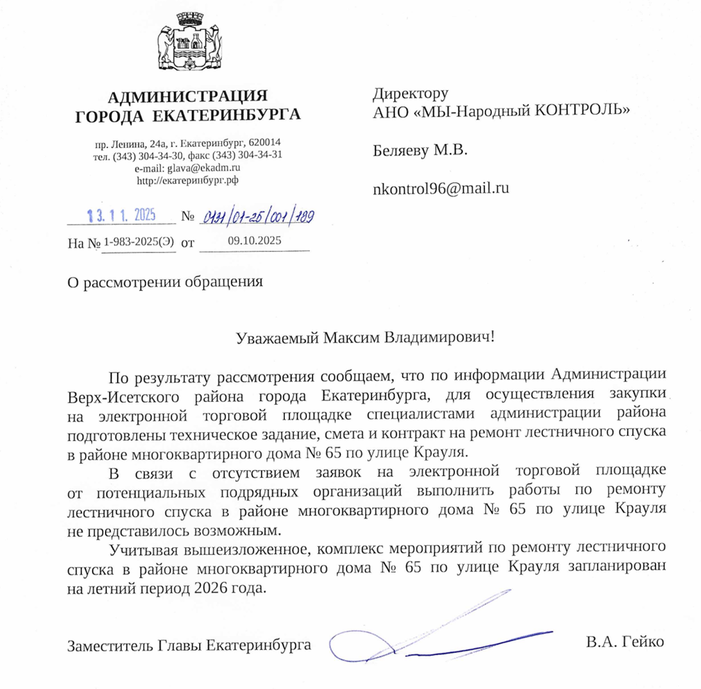 В начале октября из Екатеринбурга было получено обращение о состоянии лестничного спуска напротив дома №65 по улице Крауля. Жильцы отмечали, что ступени находятся в аварийном состоянии с 2023 года, и районная администрация до сих пор не провела ремонт. По их словам, несколько обращений к властям не дали результата: районная администрация ссылается на недостаток финансирования, а прокуратура перенаправляет жалобы обратно в администрацию.
