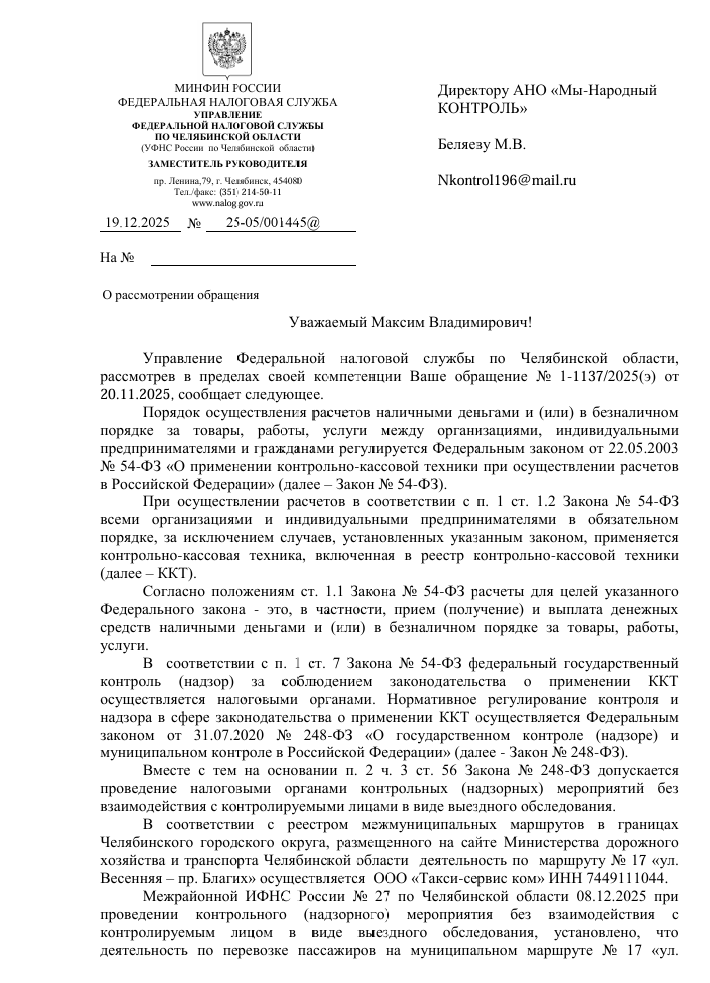 В середине ноября из Челябинска было получено обращение о возможных нарушениях в сфере пассажирских перевозок на маршрутном такси № 17. Как сообщалось, водители этого маршрута регулярно отказываются принимать безналичную оплату через терминалы, предлагая пассажирам рассчитываться наличными либо переводами на личные банковские карты. По мнению заявителя, такие действия противоречат требованиям законодательства и создают неравные и непрозрачные условия оплаты проезда.
