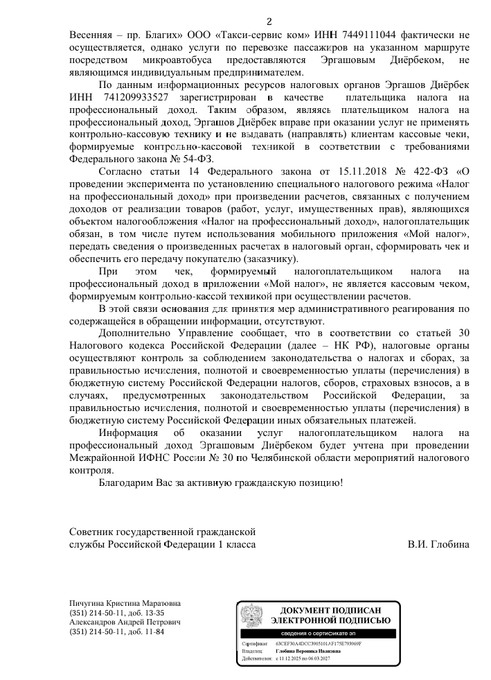 Налоговые органы установили, что перевозки на маршруте № 17 фактически осуществляет физическое лицо, не являющееся индивидуальным предпринимателем, но зарегистрированное как самозанятый. В этом статусе водитель вправе не использовать контрольно-кассовую технику и не выдавать кассовые чеки, формируемые ККТ, а формировать чеки через приложение «Мой налог».
