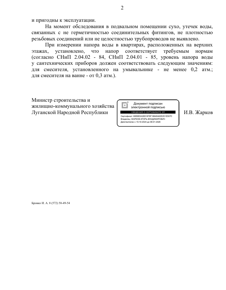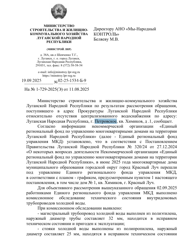 В официальном ответе Министерство строительства и ЖКХ ЛНР сообщило, что по результатам проверки, проведённой новой управляющей организацией, техническое состояние водопроводных коммуникаций признано удовлетворительным. Ведомство заявило, что обследование не выявило нарушений герметичности, а замеры давления воды на верхних этажах соответствуют нормативным требованиям.