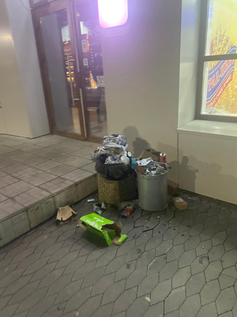 Лица, осуществляющие предпринимательскую деятельность в этих помещениях, отказываются убирать мусор. Утром мусор убирает дворник ЖК (УК «Горизонты»). В течение дня отходы накапливаются и разносятся по территории до следующего утра. В выходные дни мусор вообще не убирается. УК и предприниматели на неоднократные просьбы урегулировать «наболевший» вопрос по своевременной уборке мусора не реагируют.