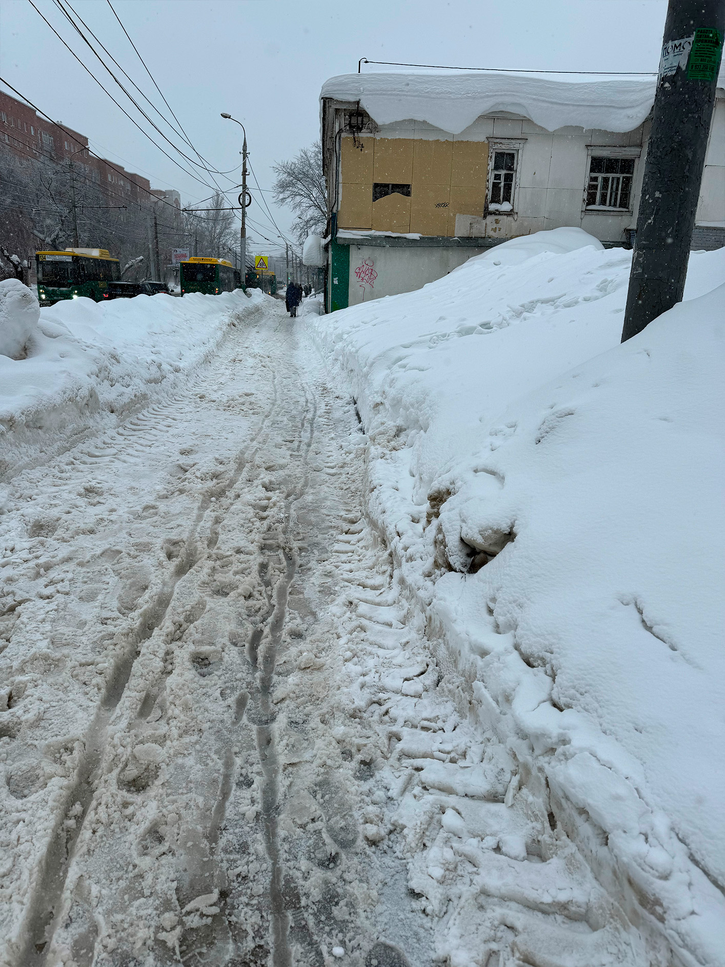 16.02.2026, город Пенза, улицы: Калинина, Чкалова, Свердлова — тротуары не чищены. До садика с ребёнком на коляске идёшь с большим трудом. В основном тропинка — это то, что люди натоптали. По тропинке либо ты с коляской, либо идут люди.