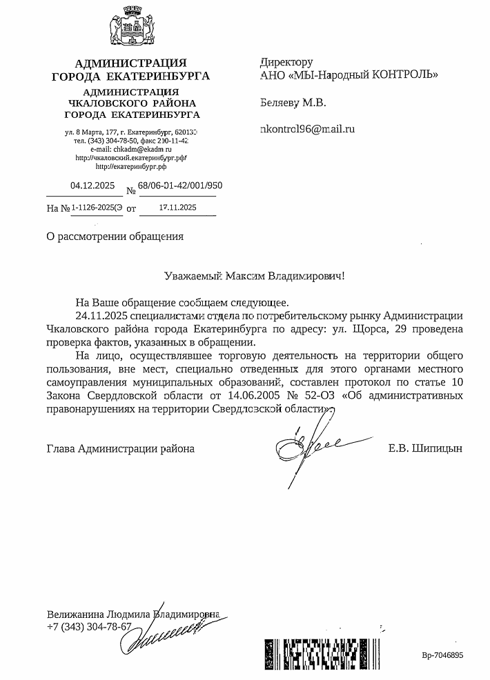 В ответ на обращение, 24 ноября 2025 года, специалисты отдела по потребительскому рынку Администрации Чкаловского района провели проверку по указанному адресу.