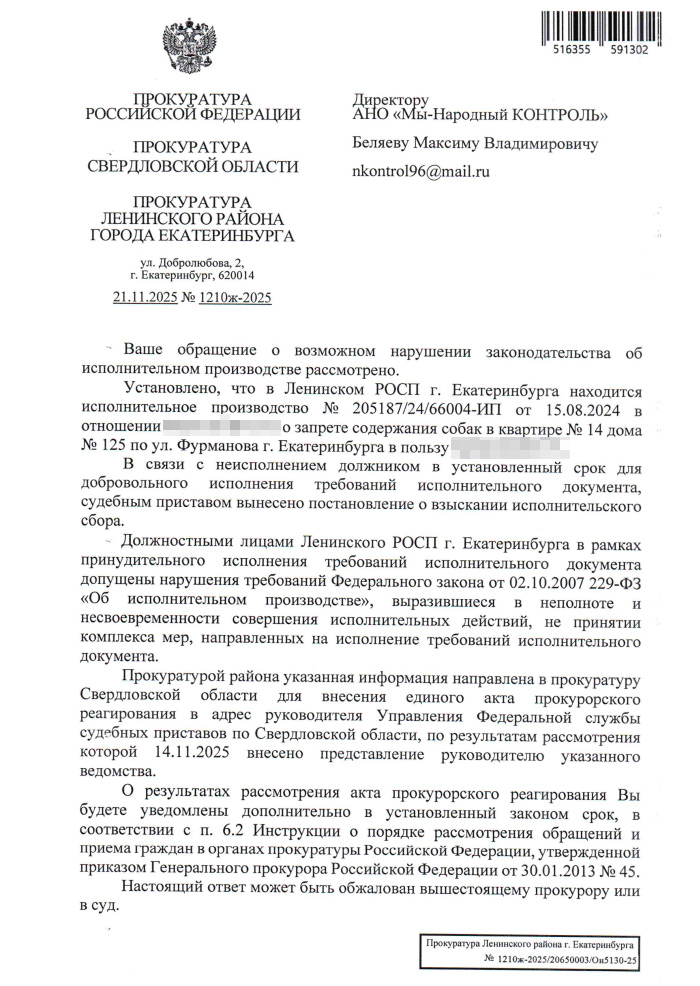 В ходе проверки установлено, что приставы не принимали достаточных мер для исполнения судебного решения, ограничившись взысканием исполнительского сбора. По результатам рассмотрения дела 14 ноября 2025 года прокуратура Свердловской области внесла представление руководителю регионального управления ФССП с требованием устранить нарушения. Заявителям обещано уведомить их о результатах рассмотрения прокурорского акта в установленный законом срок.