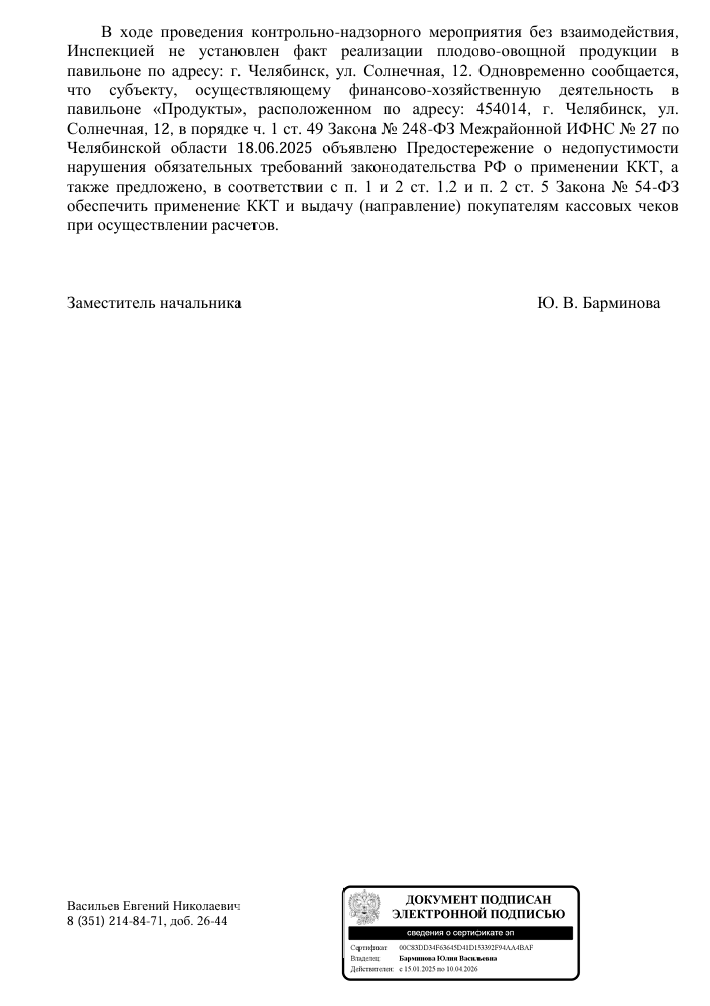 Межрайонная ИФНС №27 по Челябинской области сообщила, что в ходе контрольно-надзорного мероприятия факт реализации плодово-овощной продукции в указанном павильоне не установлен. При этом было отмечено, что еще 18 июня предпринимателю, осуществляющему деятельность в павильоне «Продукты», было объявлено предостережение о недопустимости нарушения законодательства о применении ККТ. Налоговый орган обязал предпринимателя обеспечить применение контрольно-кассовой техники и выдачу чеков покупателям при осуществлении расчетов.