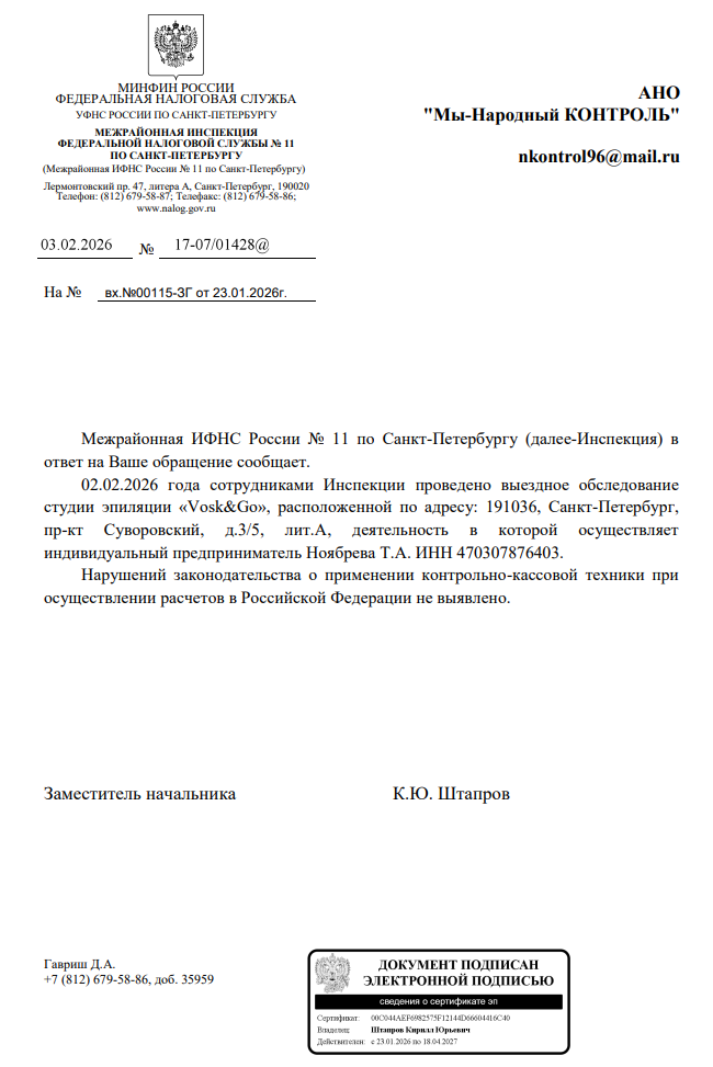 2 февраля 2026 года сотрудники инспекции провели выездное обследование студии эпиляции «VOSK&GO» по адресу проспект Суворовский, д. 3/5, лит. А. В ходе проверки нарушений законодательства о применении контрольно-кассовой техники при осуществлении расчетов выявлено не было.