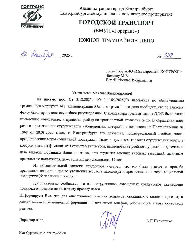 На это обращение был получен ответ от администрации Южного трамвайного депо.