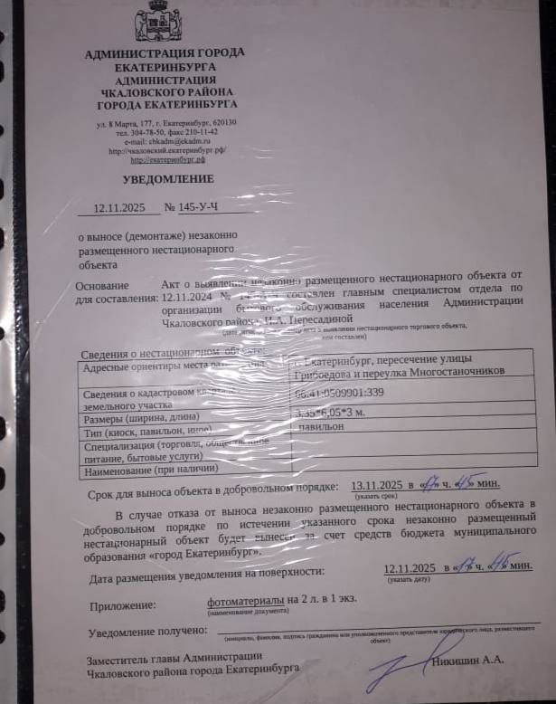 В начале ноября 2025 года губернатор Свердловской области Денис Паслер публично поручил главе Екатеринбурга приостановить демонтаж нестационарных торговых объектов (НТО) . Поводом для этого решения, по его словам, стало большое количество обращений от жителей и представителей малого бизнеса, а также активное обсуждение проблемы в медиа. Объявили о создании межведомственной рабочей группы для выработки решения и возможного пересмотра региональных нормативных актов. В это же время администрация Чкаловского района Екатеринбурга продолжает снос НТО по адресу Грибоедова, 22.