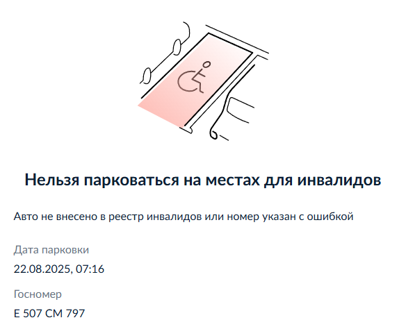 22 августа 2025 г., 7:16, г. Москва, ул. Крупской, д. 14. Место для инвалидов занимает автомобиль без знака «Инвалид», информация в реестре автомобилей инвалидов отсутствует.