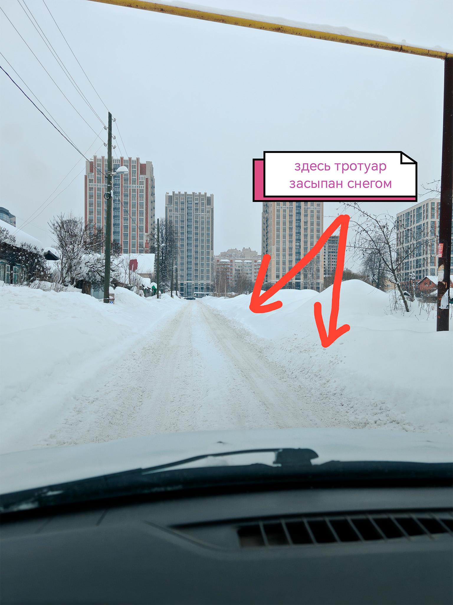 г. Ижевск, проезд Жуковского, на всём участке от улицы Авангардная до нового ЖК «Трилогия». Проезжая часть не чистится от снега во всю ширину, в результате чего два автомобиля во встречных направлениях не могут разъехаться. С одной стороны проезжей части есть выделенный тротуар (показан на фото), но за весь зимний период 2025–2026 годов его ни разу не чистили от снега, а наоборот заваливали снегом от проезжей части. Пешеходы вынуждены ходить по дороге. Прошу повлиять на ситуацию.