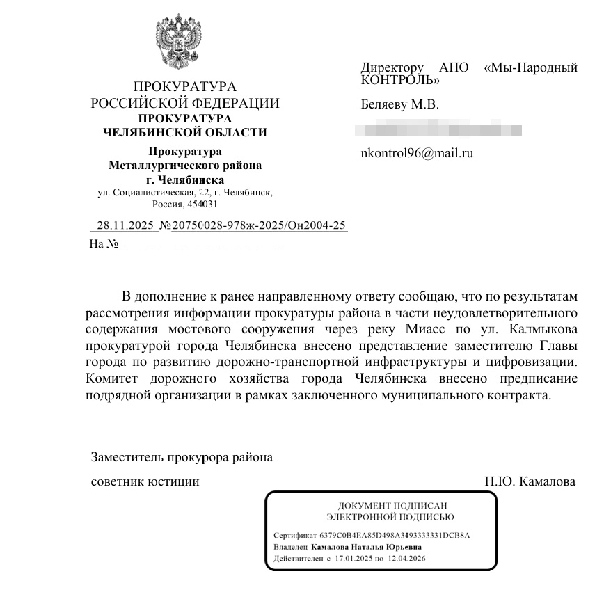 По результатам рассмотрения обращения по состоянию моста на улице Калмыкова было внесено представление заместителю Главы города по развитию дорожно-транспортной инфраструктуры и цифровизации. Комитет дорожного хозяйства города Челябинска направил предписание подрядной организации в рамках заключенного муниципального контракта для устранения недостатков мостового сооружения.