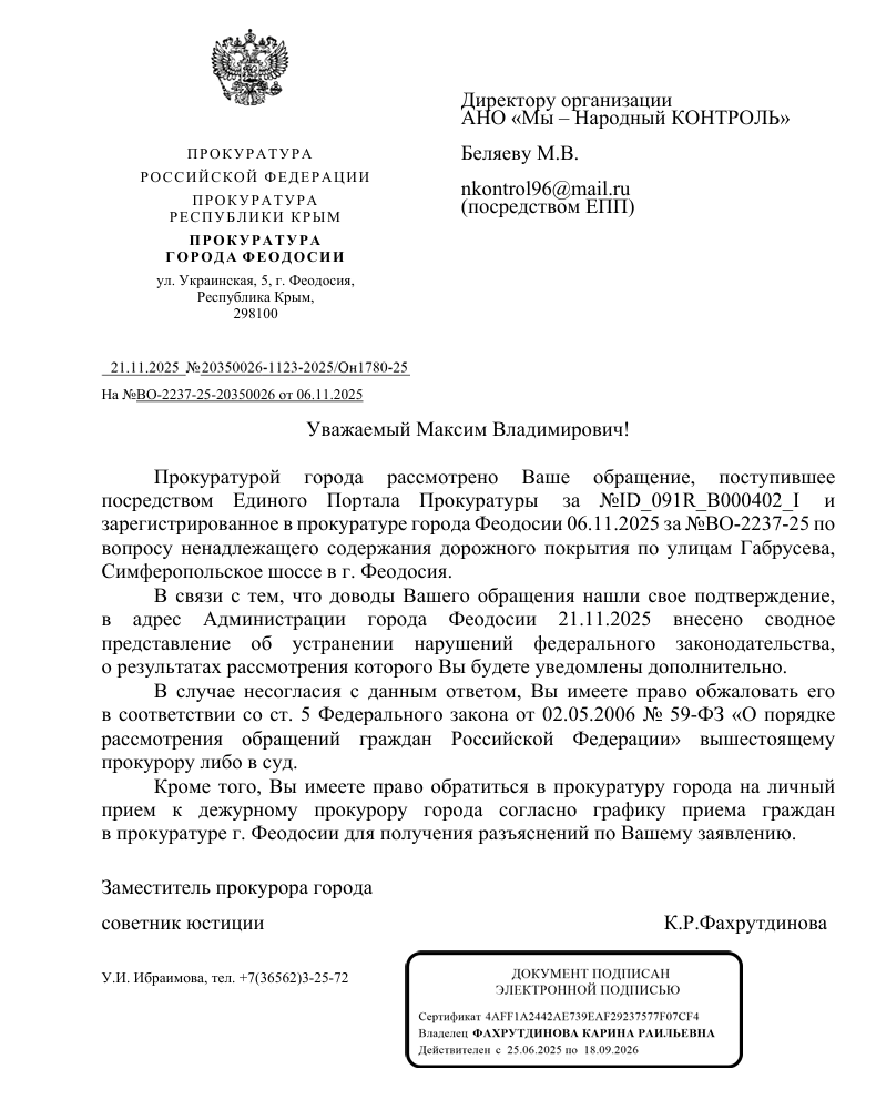 Благодарим неравнодушных граждан за Ваши обращения. Если Вы не согласны с данным ответом Прокуратуры города Феодосия, пожалуйста, сообщите об этом нам (желательно с фото/видео доказательствами выполнения работы в неполном объеме или ее невыполнении).