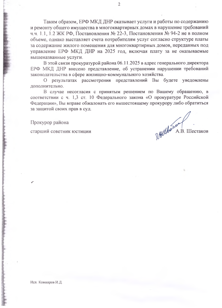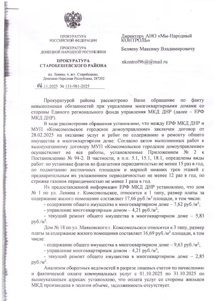 По результатам проверки прокуратура внесла представление генеральному директору ЕРФ МКД ДНР 06.11.2025 об устранении нарушений в сфере ЖКХ. Надзорный орган признал, что фонд нарушает требования жилищного законодательства, взимая плату за невыполненные работы. Жители будут дополнительно уведомлены о результатах рассмотрения представления.