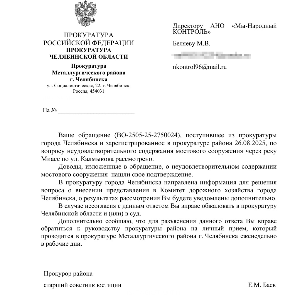Прокуратура Челябинска в официальном ответе подтвердила факт ненадлежащего содержания мостового сооружения. Надзорный орган направил информацию в городской Комитет дорожного хозяйства для внесения представления об устранении нарушений. Заявителю пообещали уведомить о результатах рассмотрения, сохранив за ним право обжалования решения в случае необходимости.
