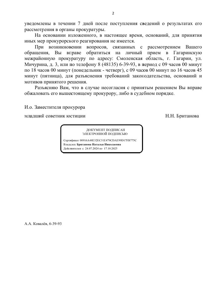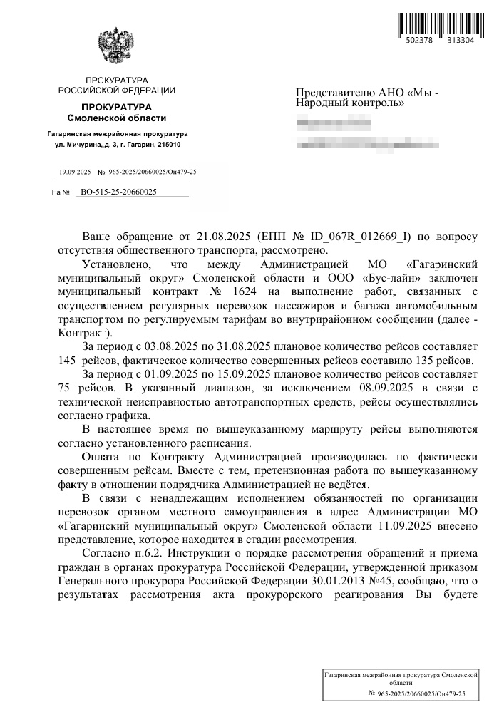 Проверка выявила, что за август 2025 года перевозчик не выполнил 10 рейсов из 145 запланированных по муниципальному контракту. При этом местная администрация, хотя и оплатила только фактически выполненные рейсы, не провела с подрядчиком претензионную работу. Прокуратура усмотрела в этом бездействии нарушение со стороны властей и 11 сентября 2025 года внесла представление в адрес администрации Гагаринского муниципального округа. На момент ответа перевозки осуществляются по расписанию.