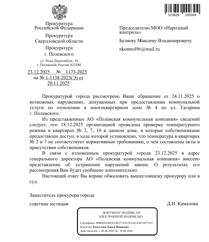 В декабре АО «Полевская коммунальная компания» обследовало несколько квартир в доме, где был подтверждён факт несоответствия температуры нормативным требованиям. По итогам проверки прокуратура внесла представление в адрес руководства коммунальной организации с требованием устранить выявленные нарушения. О результатах исполнения представления заявителям пообещали сообщить дополнительно.