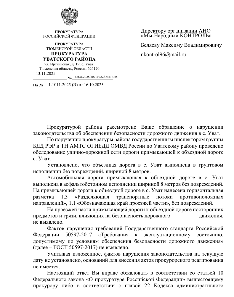 В ответе прокуратуры Уватского района сообщается, что по поручению ведомства была проведена проверка улично-дорожной сети.