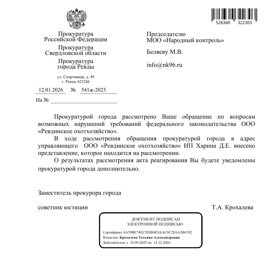 По результатам рассмотрения обращения прокуратура внесла представление в адрес управляющего ООО «Ревдинское охотхозяйство» ИП Харина Д.Е. В документе указано на необходимость соблюдения требований федерального законодательства и обеспечения равного доступа граждан к охотничьим угодьям. Представление находится на рассмотрении, и заявителю будет дополнительно сообщено о результатах его исполнения.