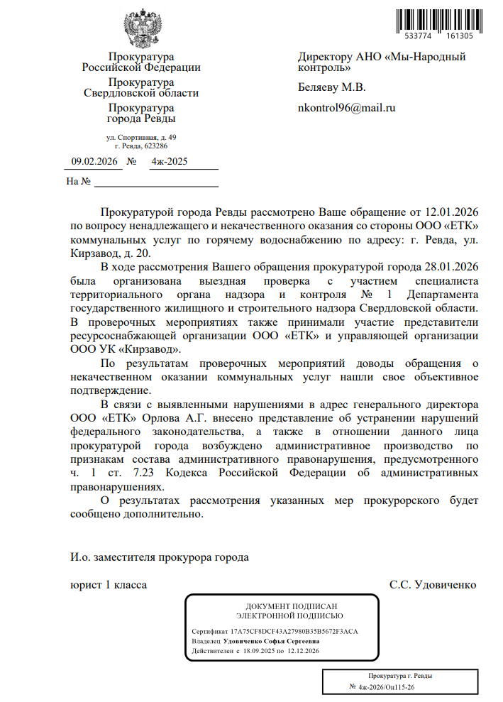 В официальном ответе надзорного ведомства сообщается, что доводы заявителя нашли объективное подтверждение. В отношении генерального директора ООО «ЕТК» внесено представление об устранении нарушений, также возбуждено административное дело по статье о нарушении нормативов предоставления коммунальных услуг. О результатах рассмотрения принятых мер прокуратура обещает сообщить дополнительно.