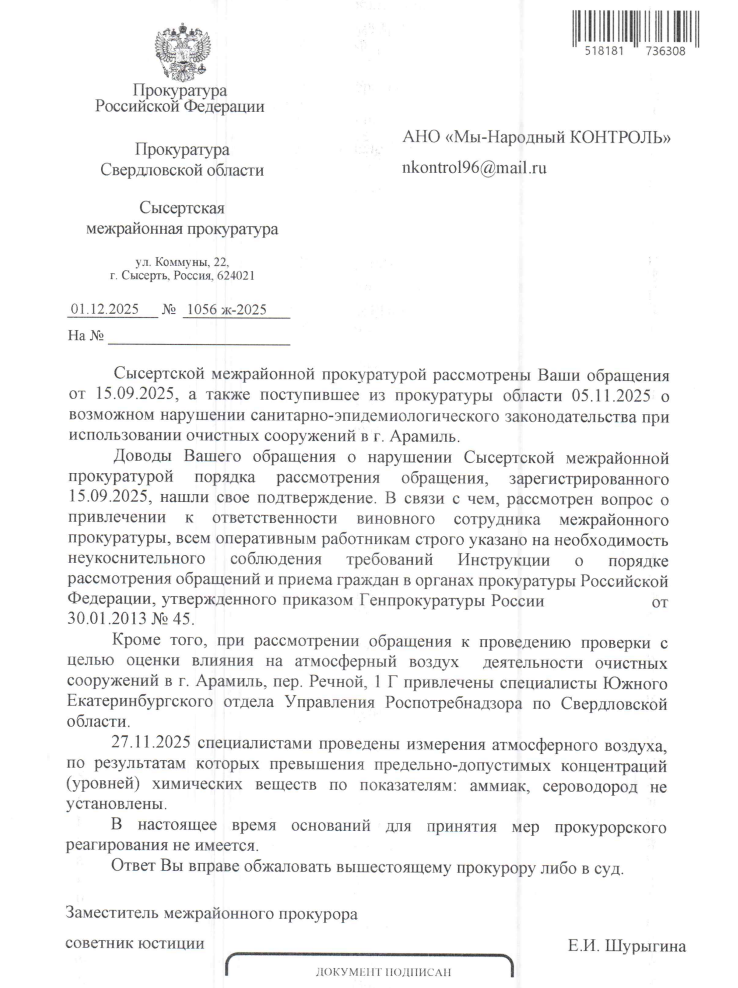 В официальном ответе Сысертская межрайонная прокуратура признала, что допустила нарушение сроков рассмотрения первоначального обращения.