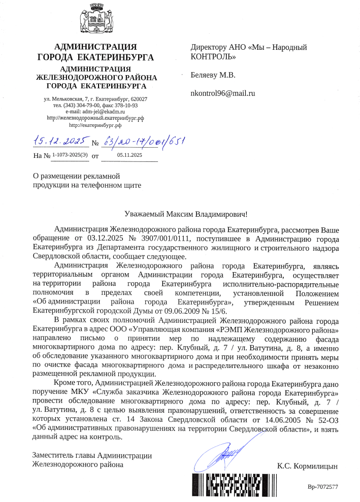 На обращение был получен ответ от администрации Железнодорожного района.