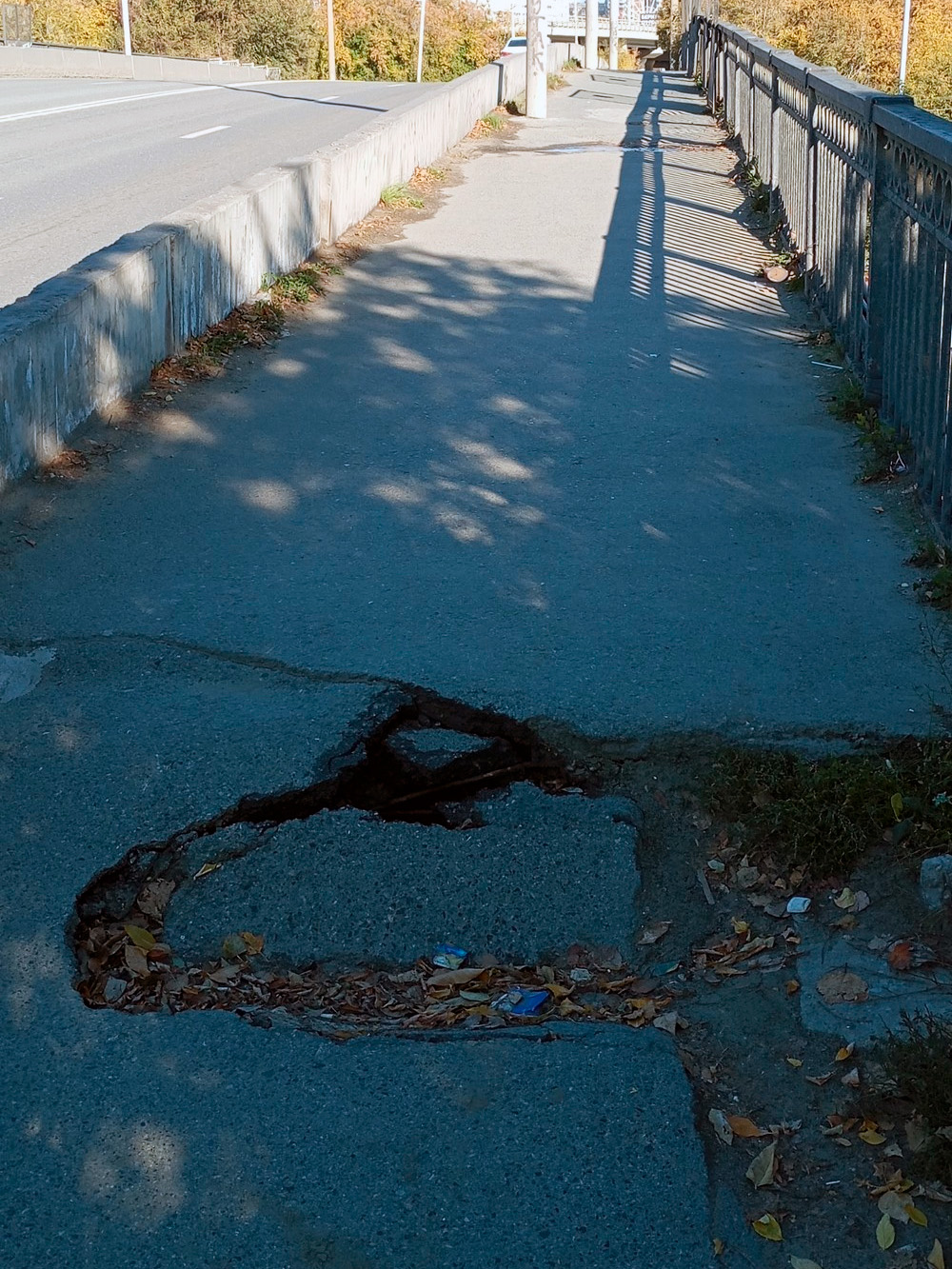 Ещё в конце сентября жители сообщили о крупной яме на пешеходной зоне моста, а в конце октября администрация Железнодорожного района провела проверку и подтвердила разрушение железобетонной плиты смотрового колодца. Работы по ремонту тротуара до сих пор не начаты, а администрация ждёт ответы от всех потенциально ответственных организаций для определения дальнейших мер.