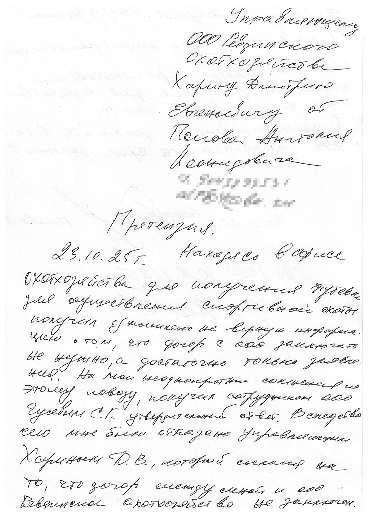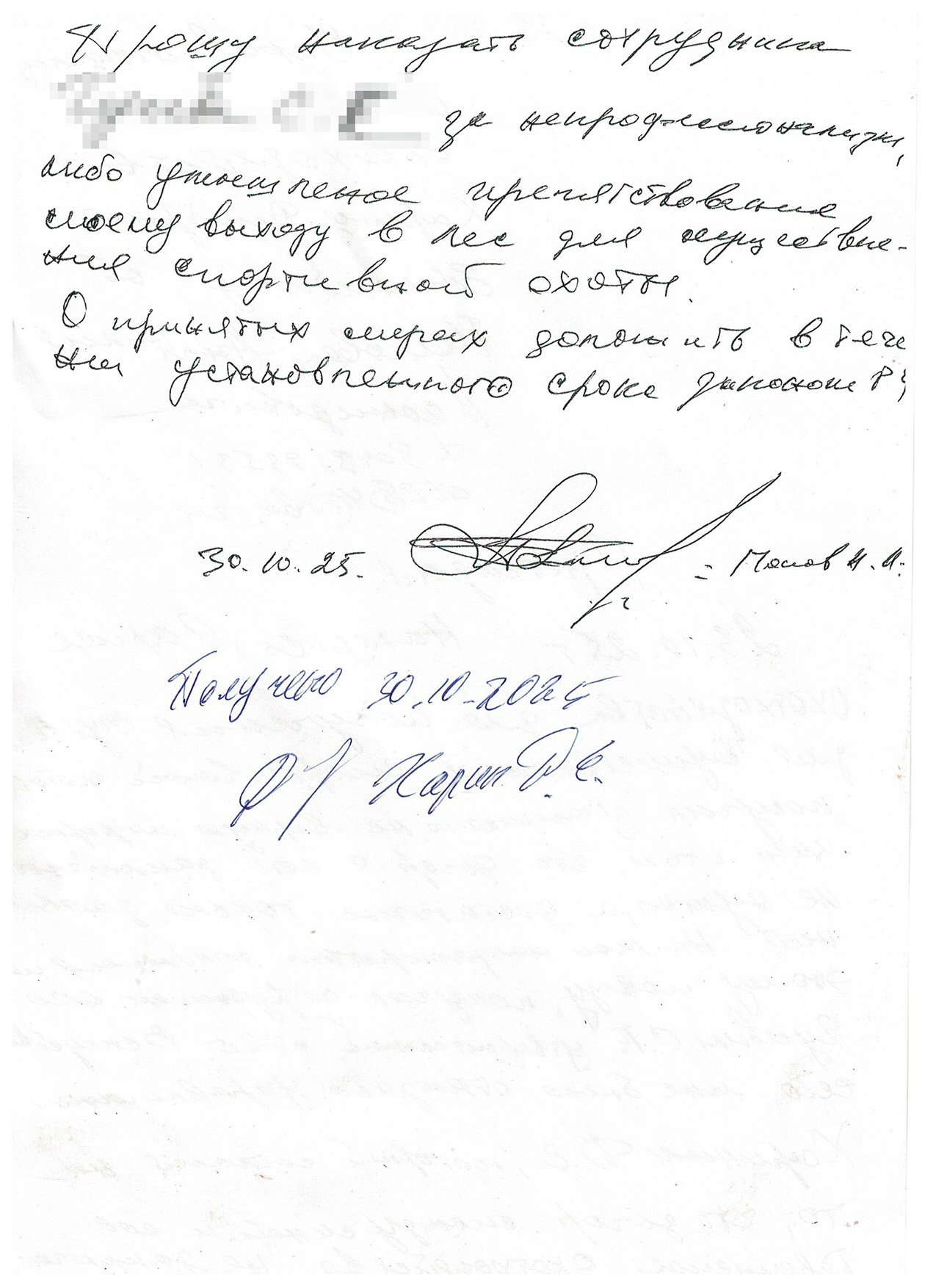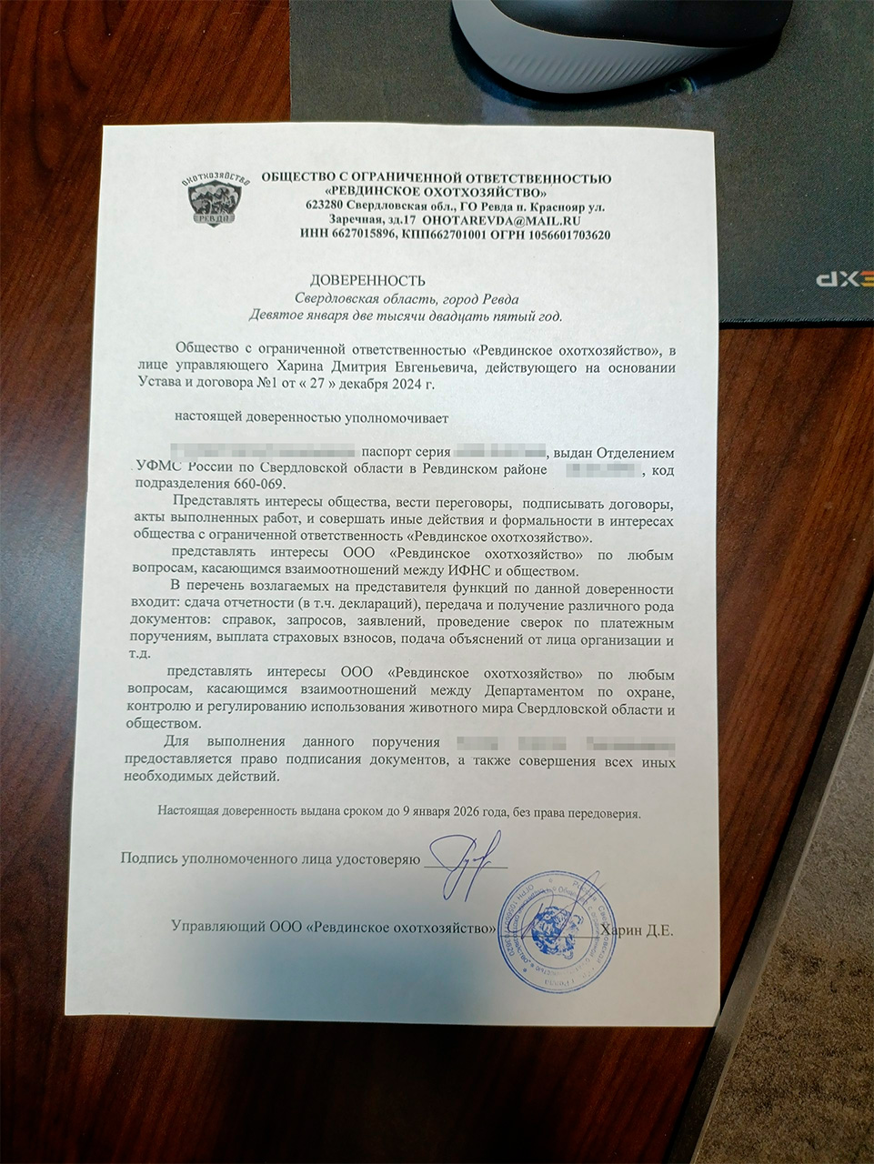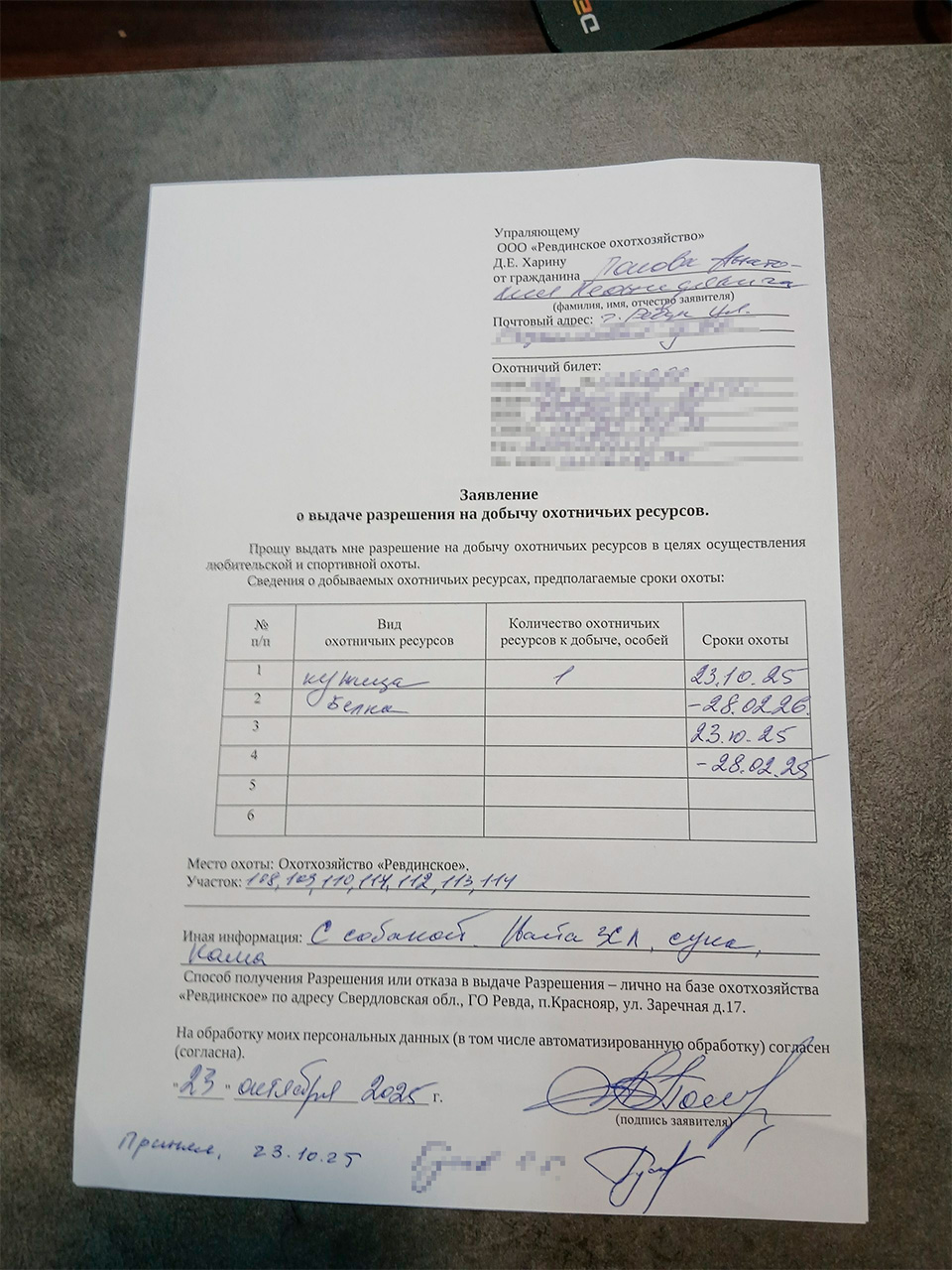 Однако по истечении заявленного срока мне на почту поступил отказ за подписью управляющего ООО «Ревдинское охотхозяйство» Харина Д. Е. со ссылкой на подпункт «И» пункта № 15 Приложения № 1 к приказу Минприроды РФ от 07.04.2025 № 178. Изучив этот подпункт, я понял, что Хариным Д. Е. приводится ссылка на отсутствие договора между мной и ООО «Ревдинское охотхозяйство», хотя в разговоре с уполномоченным С. Г. я упоминал необходимость заключения договора не менее двух раз.