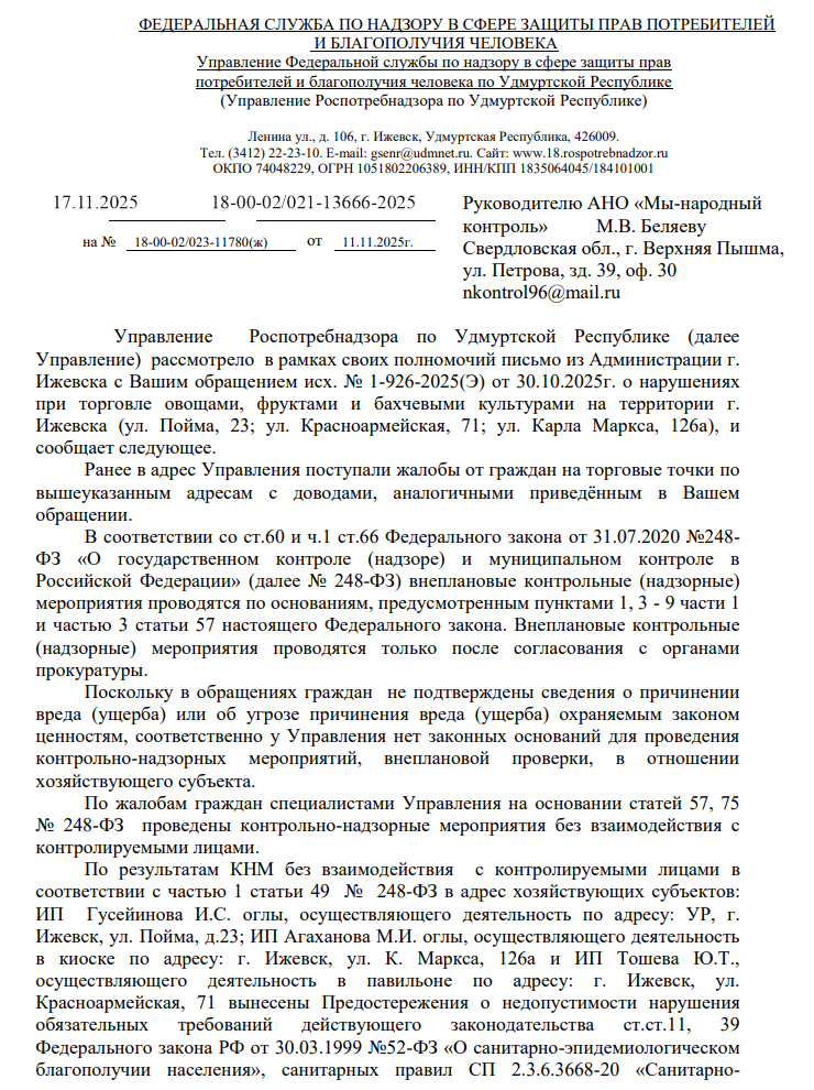 В сентябре и октябре из Ижевска поступило несколько обращений о нарушениях при торговле овощами, фруктами и бахчевыми культурами на территории города. Жалобы касались торговли на овощной базе по ул. Пойма, 23, у нестационарного объекта на ул. Красноармейская, 71 и бахчевого развала на перекрёстке ул. Вадима Сивкова и Октябрьского переулка.
