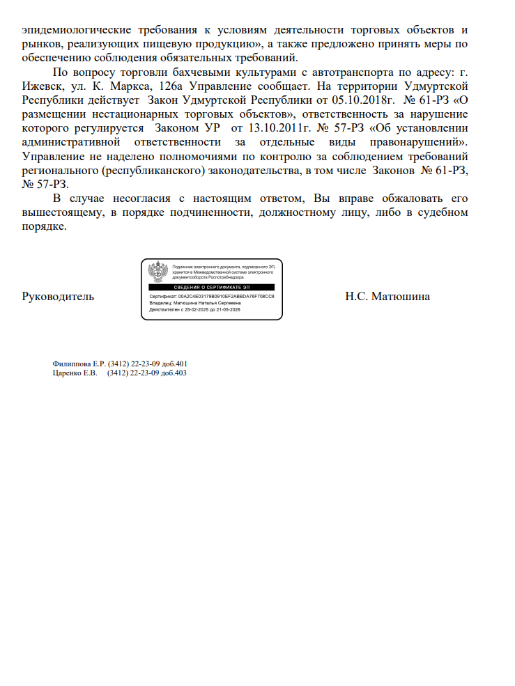 В ответ Управление Роспотребнадзора по Удмуртской Республике сообщило, что в рамках своих полномочий обращения рассмотрены.