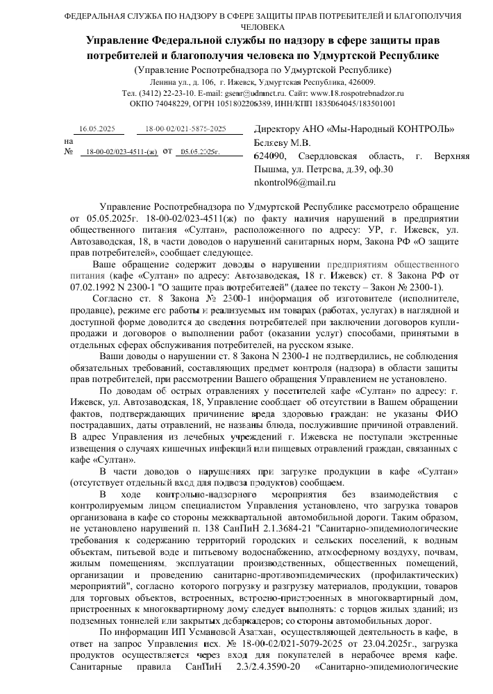 Из г. Ижевска было получено обращение о возможных нарушениях в кафе «Султан» на ул. Автозаводская, 18. Жители жаловались на отсутствие перевода религиозной надписи на рекламной вывеске, возможную дискриминацию по религиозному признаку, нарушение санитарных норм, вызывающее отравления, а также отсутствие отдельного входа для подвоза продуктов.
