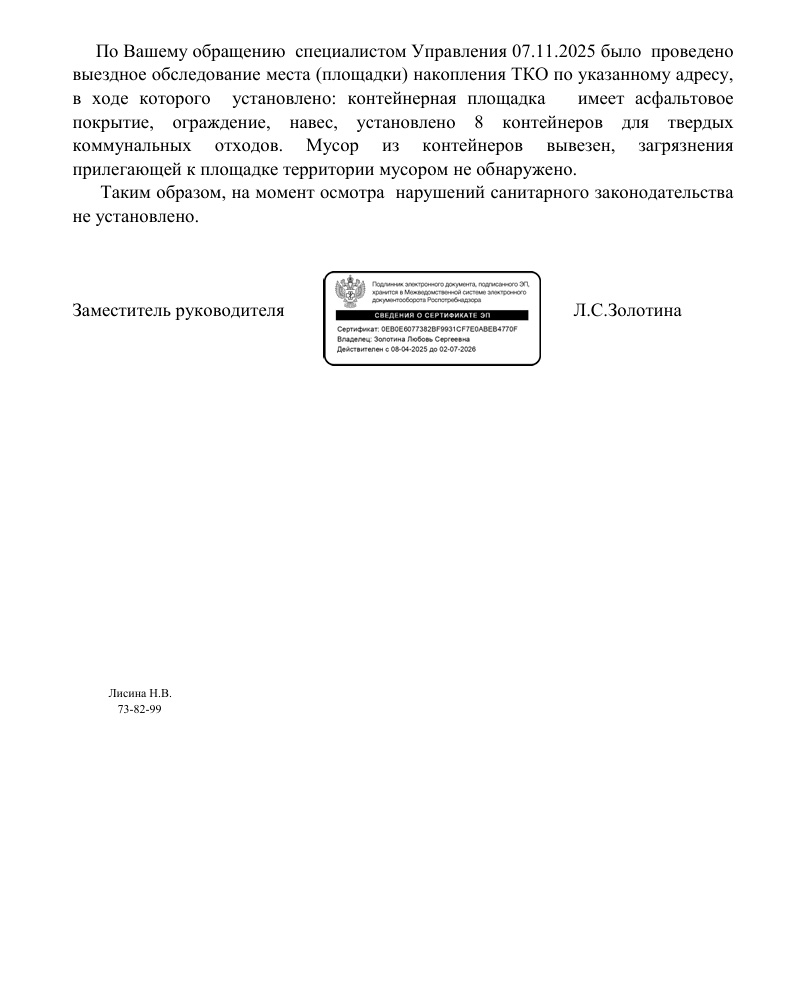 Специалисты ведомства осмотрели контейнерную площадку и зафиксировали, что она соответствует всем требованиям: имеет асфальтовое покрытие, ограждение, навес и необходимое количество контейнеров. Мусор был своевременно вывезен, загрязнений территории не обнаружено. Таким образом, на момент проверки нарушений санитарного законодательства не установлено.