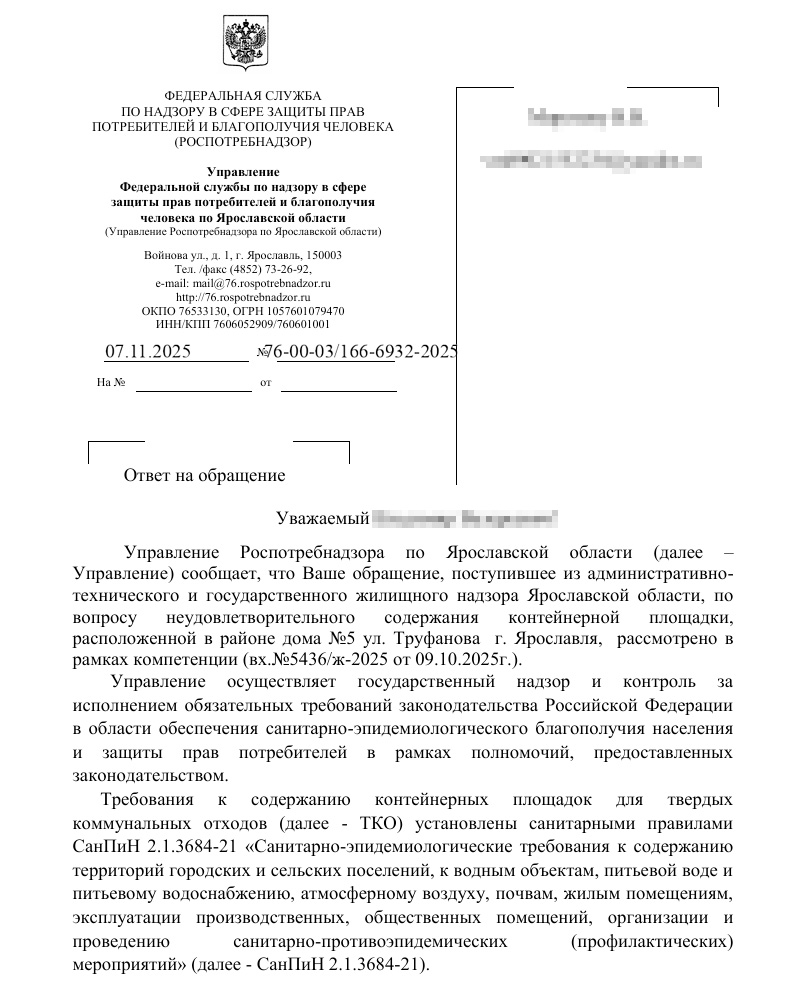В октябре инспекция административно-технического надзора Ярославской области провела проверку по данному обращению, но не обнаружила проблем. Согласно официальному ответу, на момент выезда контейнерная площадка была чистой.