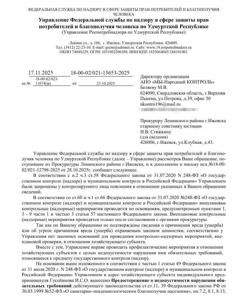 Управление Роспотребнадзора по Удмуртской Республике рассмотрело обращение, но не нашло оснований для проведения внеплановой проверки.