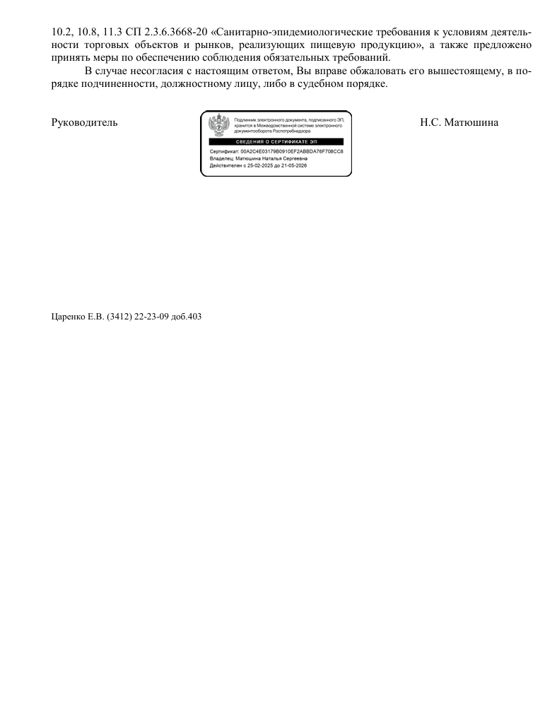 Вместо этого в адрес предпринимателя направлено предостережение о недопустимости нарушений санитарного законодательства и правил торговли. В документе перечислены конкретные требования, которые предприниматель обязан выполнить, включая соблюдение санитарно-эпидемиологических норм и правил реализации пищевой продукции.